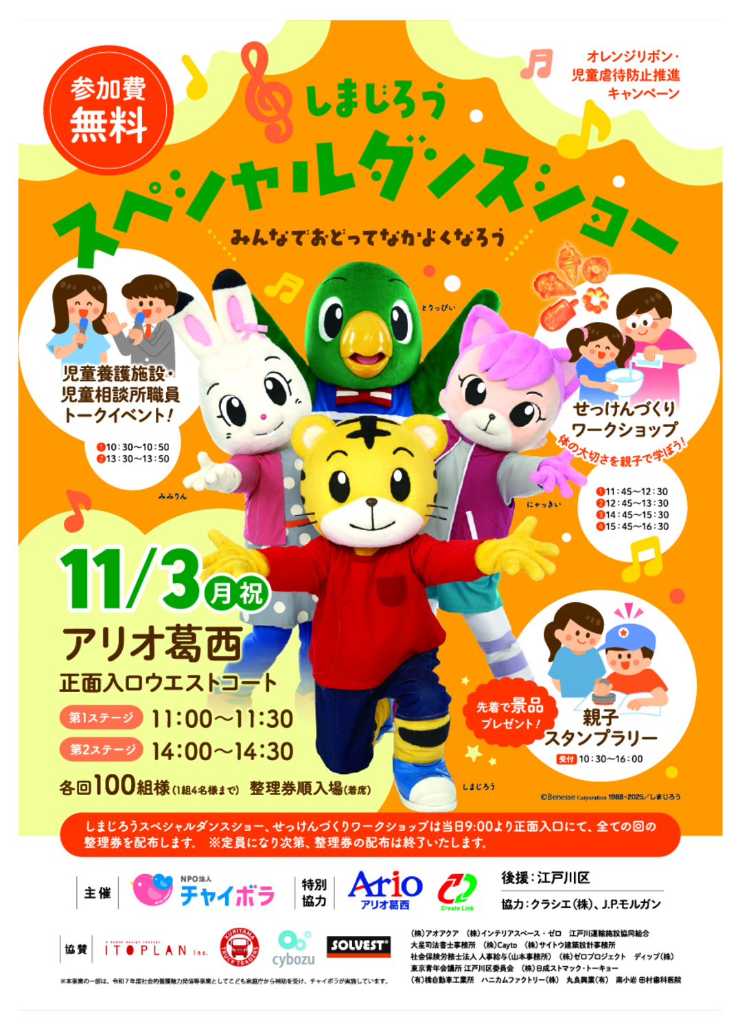 しまじろうスペシャルダンスショー、せっけんづくりワークショップは当日9:00より正面入口にて、全ての回の整理券を配布いたします。