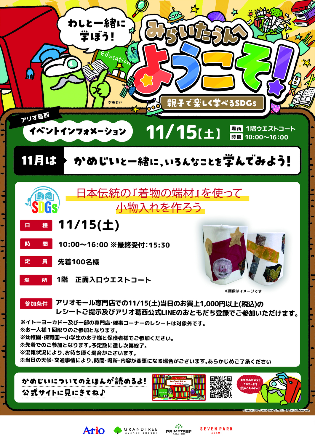 アリオモール専門店での11月15日(土)当日のお買上げ 1,000円以上(税込)のレシートのご提示 及びアリオ葛西公式LINEのおともだち登録でご参加いただけます。