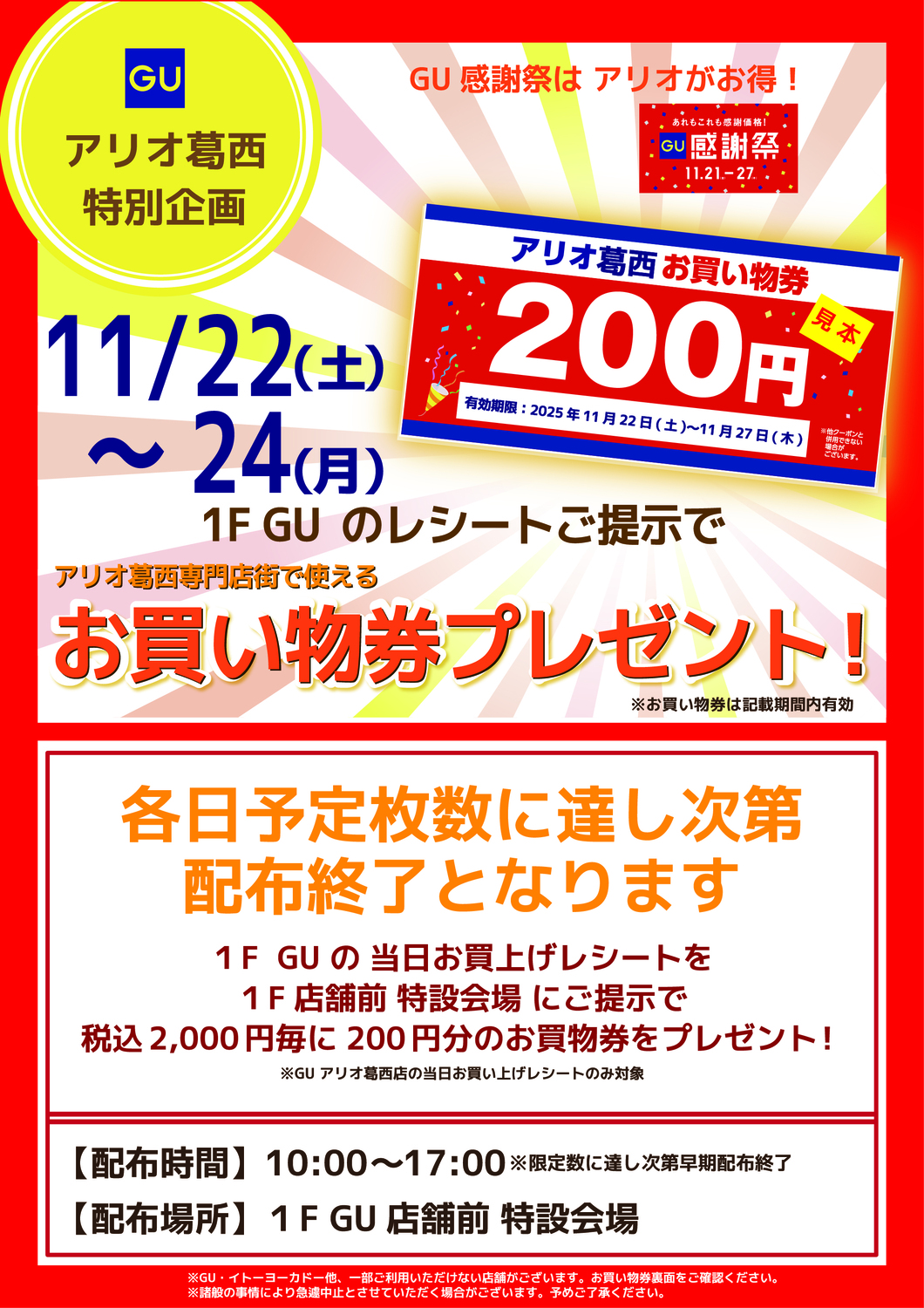 1F GUのレシートご提示でアリオ葛西専門店街で使えるお買い物券プレゼント!