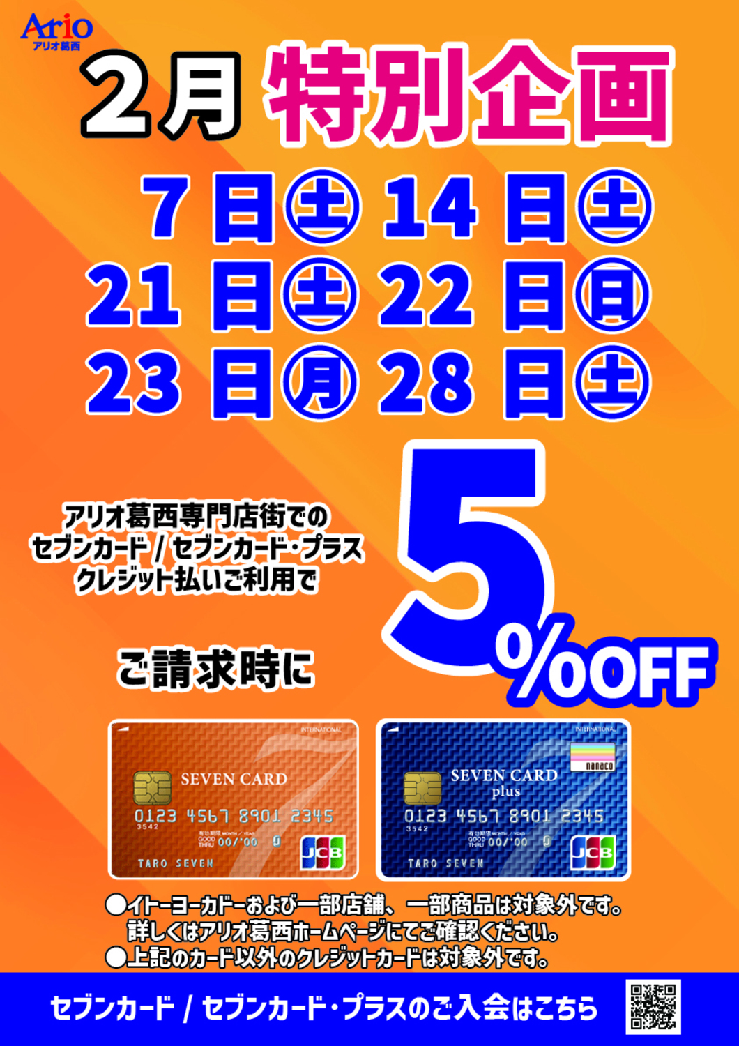 2/7(土)・2/14(土)・2/21(土)・2/22(日)・2/23(月祝)・2/28(土)の6日間アリオモール専門店街でのお買い物で