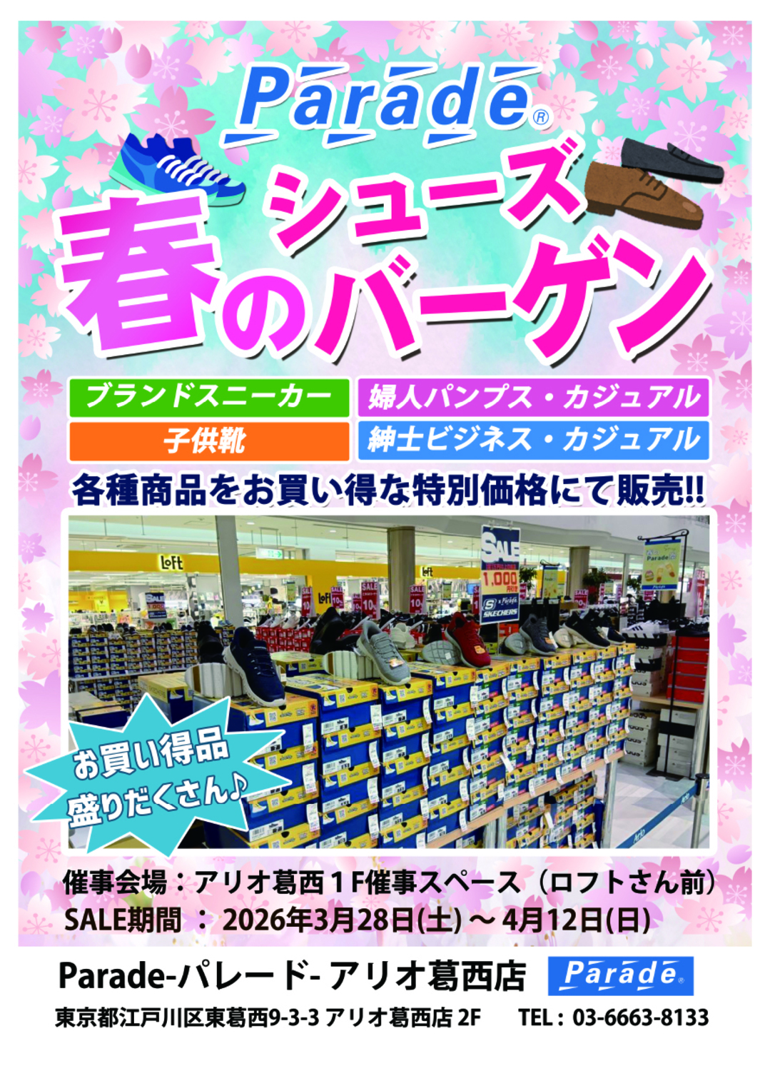 アリオ葛西2Fで営業中の靴のお店「Parade(パレード)」が催事を開催致します!