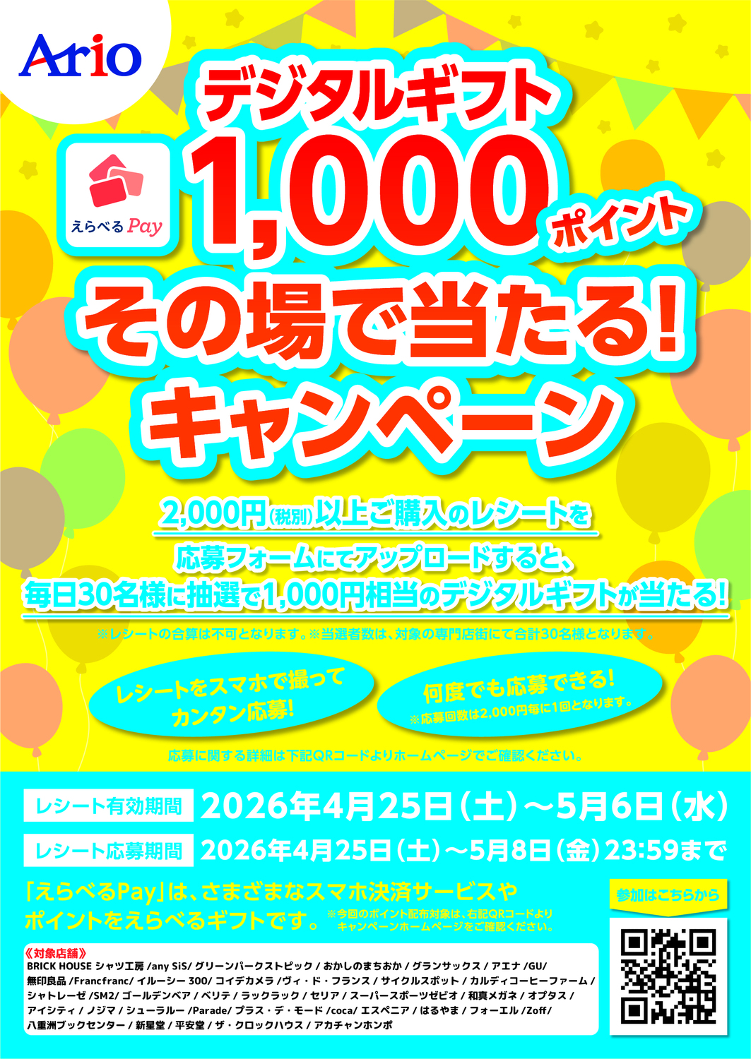 キャンペーンへは、下記URLまたは館内掲示のポスター、参加テナントのレジ前にある三角POP等からご参加いただけます。