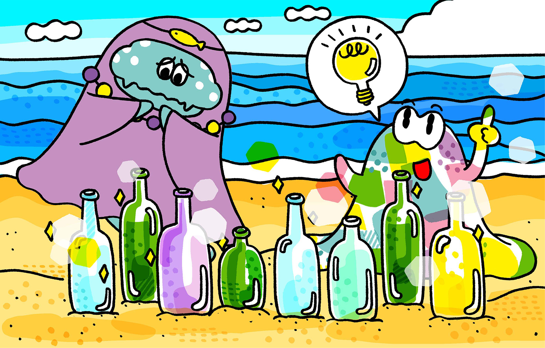 「みらいたうんの かいがんに ながれついたビンを 並べてみたけれど……。これ、すてるしかないのかしら? ねぇ、アルケミちゃん、なにかいいアイデアはない?」