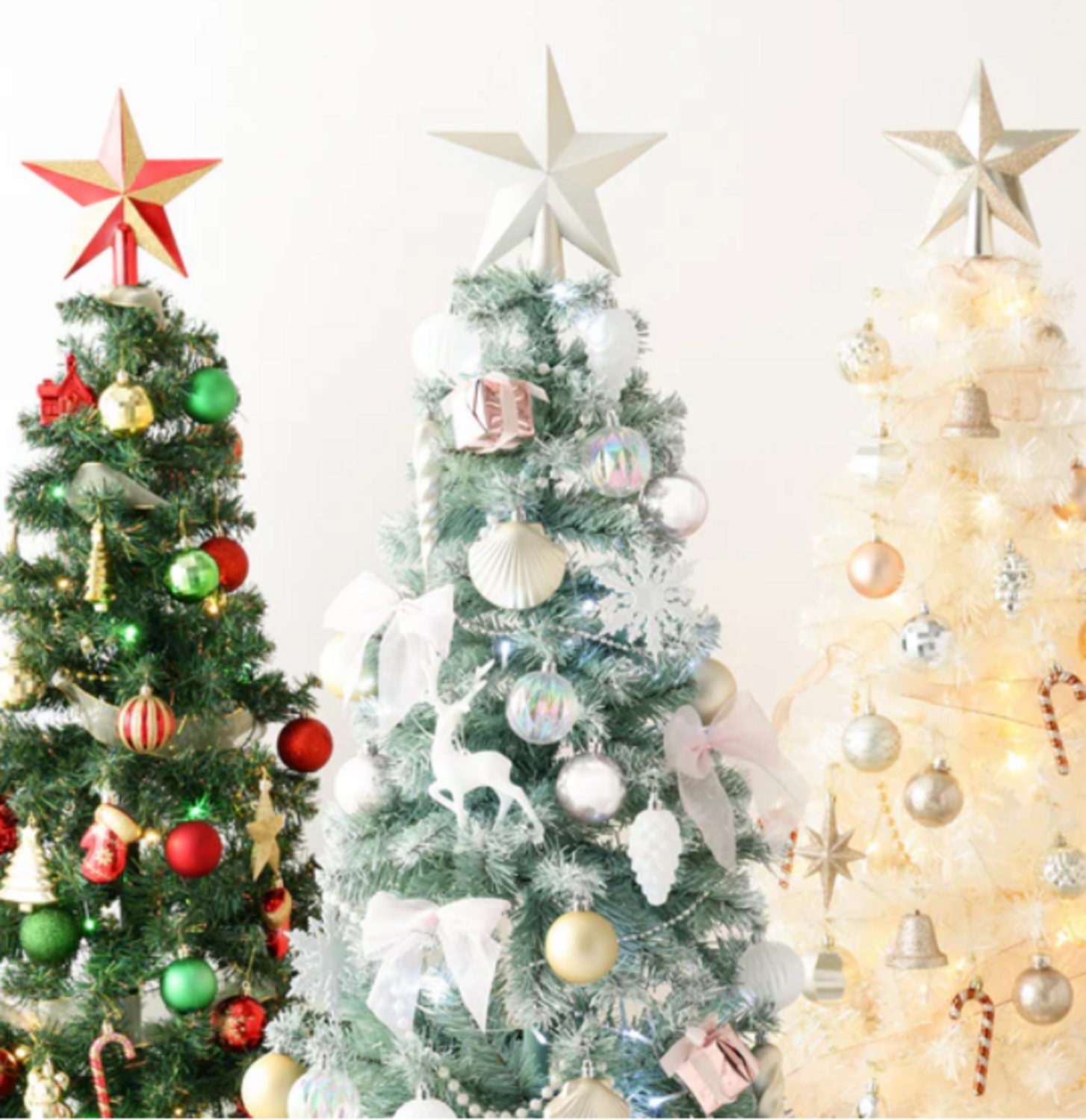 新色はピンクのリボンやトナカイ、シェルなどのオーナメントがアクセントとなり、まるで雪をまとったようなロマンティックなツリーを楽しめます。